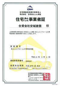 今回、新築工事瑕疵保険に加え、リフォーム工事瑕疵保険にも加入しましたので、お知らせいたします。