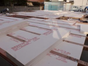 昨今多くの住宅が断熱性能を上げる為、壁面及び天井に吹付け断熱材を施工するケースが増えて来ました。しかしながら床下だけはスタイロフォーム等の断熱材を床根太(床を支える部分)にはめ込んでいく施工方法が主流です。