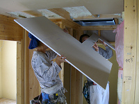 下記の写真を見て欲しい。ボード職人がパズルのピース状の様な石膏ボードを張る瞬