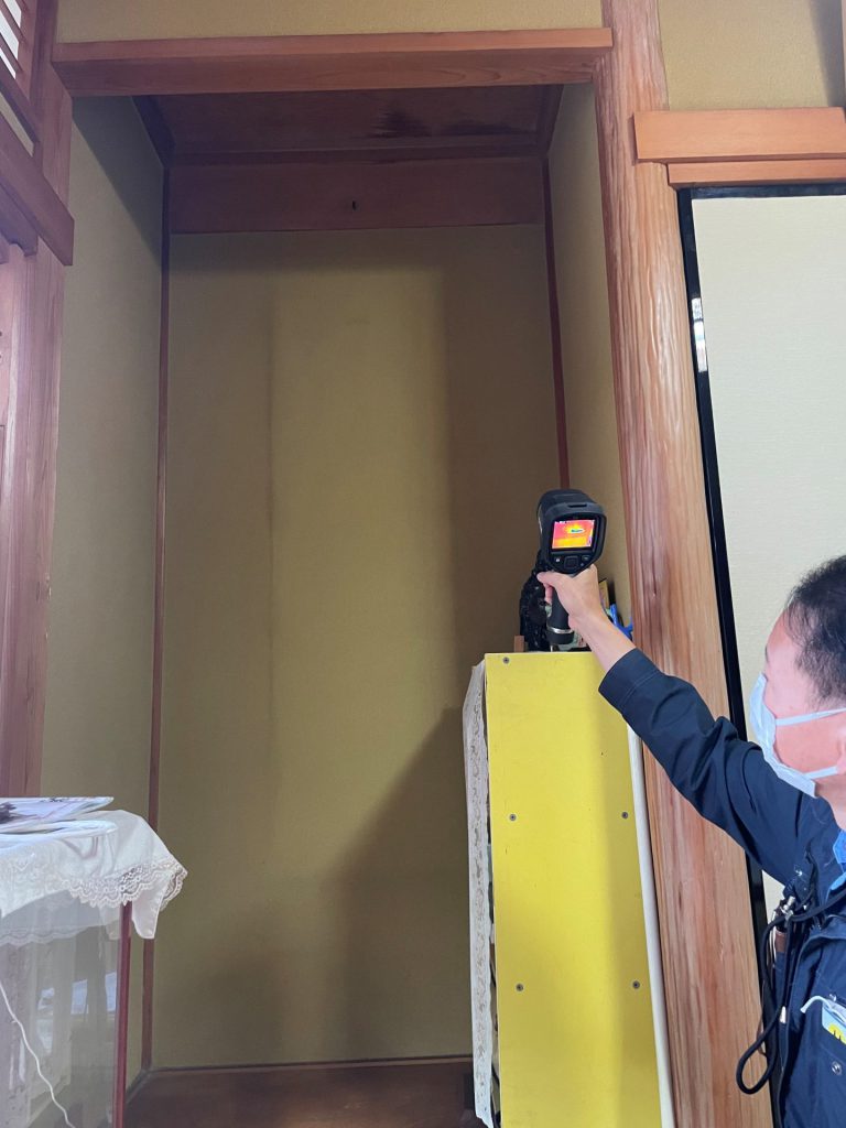 雨漏れしている床の間の上がベランダだった為、防水が劣化し、そこからの漏水ではないかと怪しい箇所を順に水を掛けながら温度センサーを見ながら調査しました。原因はベランダの笠木板金と壁との取合い部分の防水コーキングの切れでした。