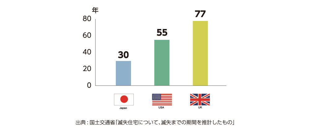 はじめに、住宅の平均寿命はアメリカが約55年、イギリスが約77年、日本は約30年と、欧米諸国に比べて、とても短いです。
