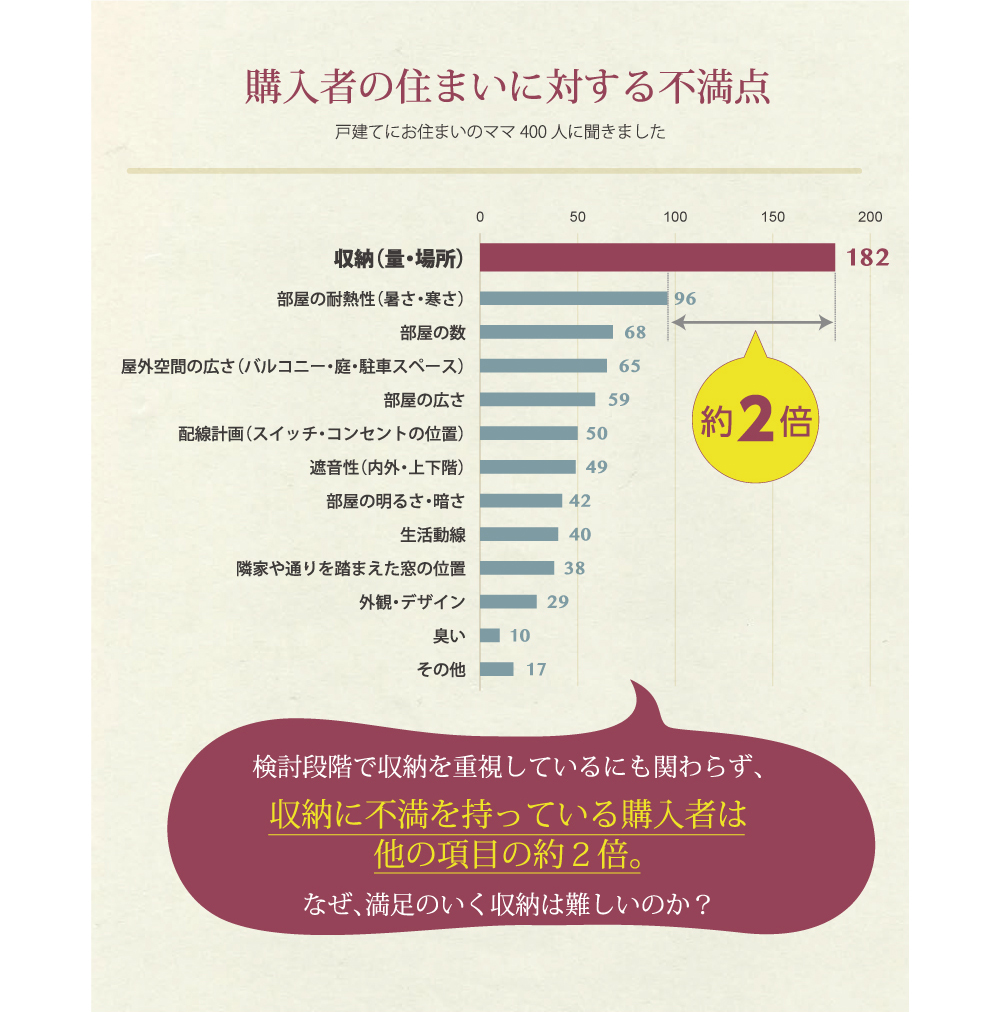 一方で「実際に戸建てにお住まいのママ400人」にアンケートを取ったところ、驚くことに「収納に不満を持っている」の割合は他の回答項目の2倍!