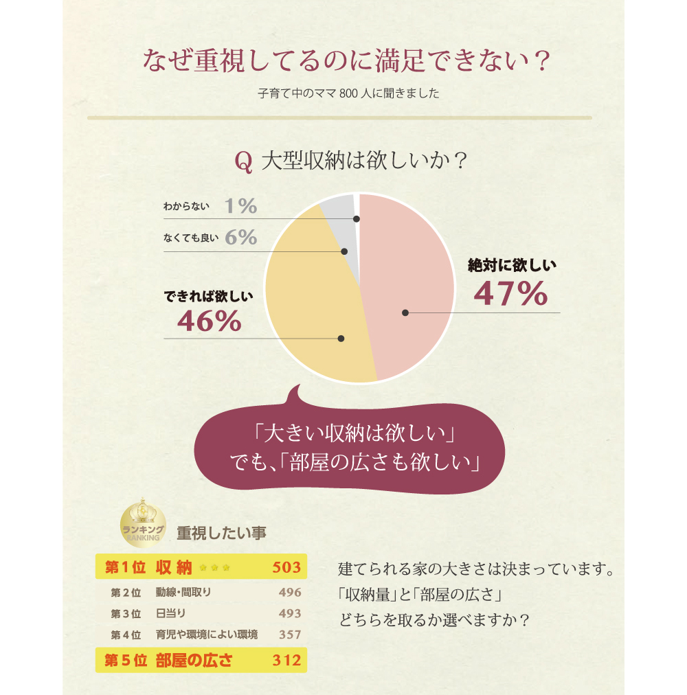 実際に「子育て中のママ800人」にアンケートを取ったところ、「収納を重視する」と答えた割合は90%を超えました!