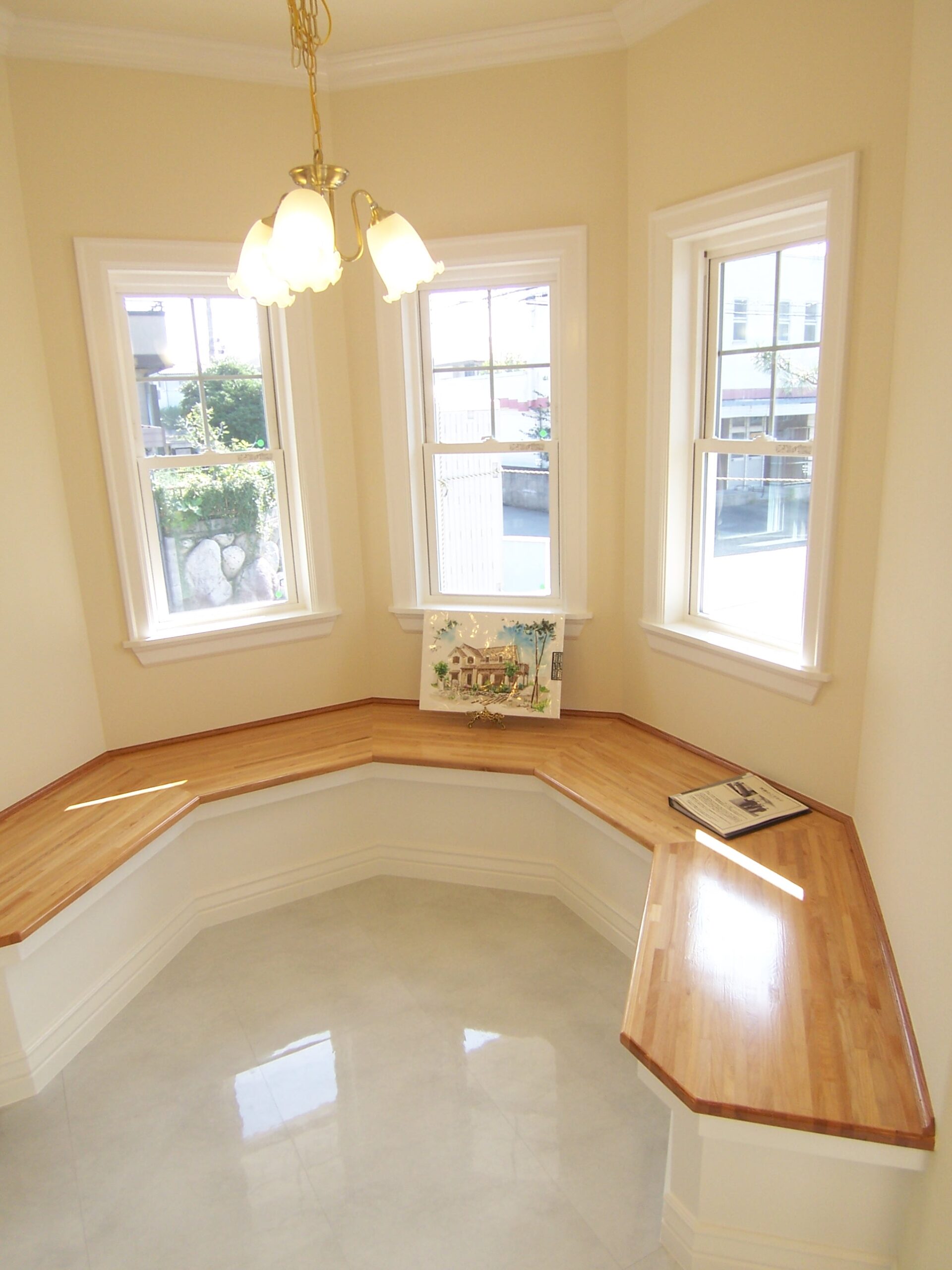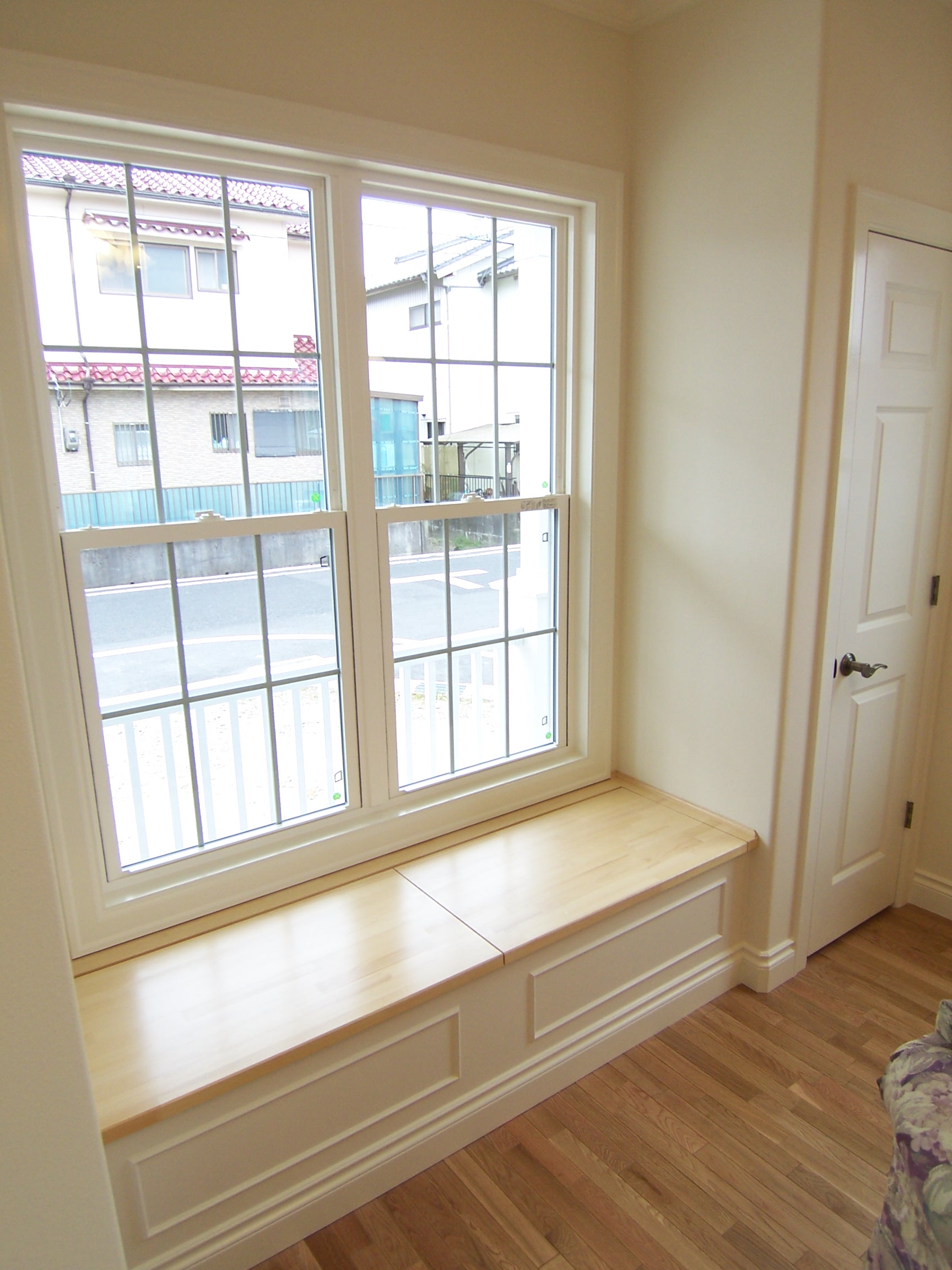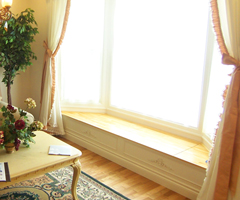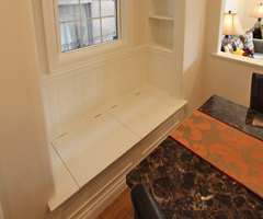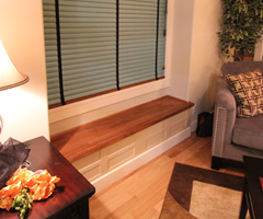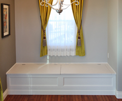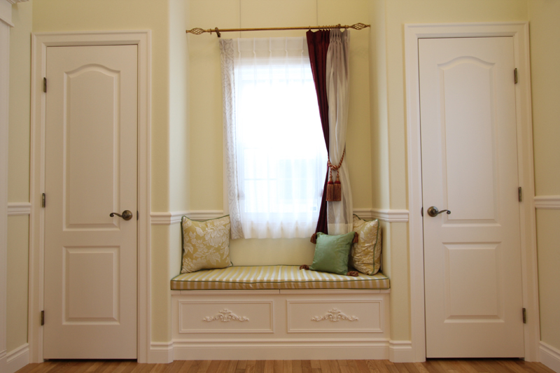 ベンチはよく出窓部分につくりますが、出窓がなくてもお部屋に変化を持たせたい場合などに採用します。側面の外側を二重貼りにして立体感を出したり、おしゃれな飾りをつけたり、帯を打ってエレガントな雰囲気を出したり、デザインもいろいろと手を加えることができるので、自分の好みに応じたベンチが楽しめます。