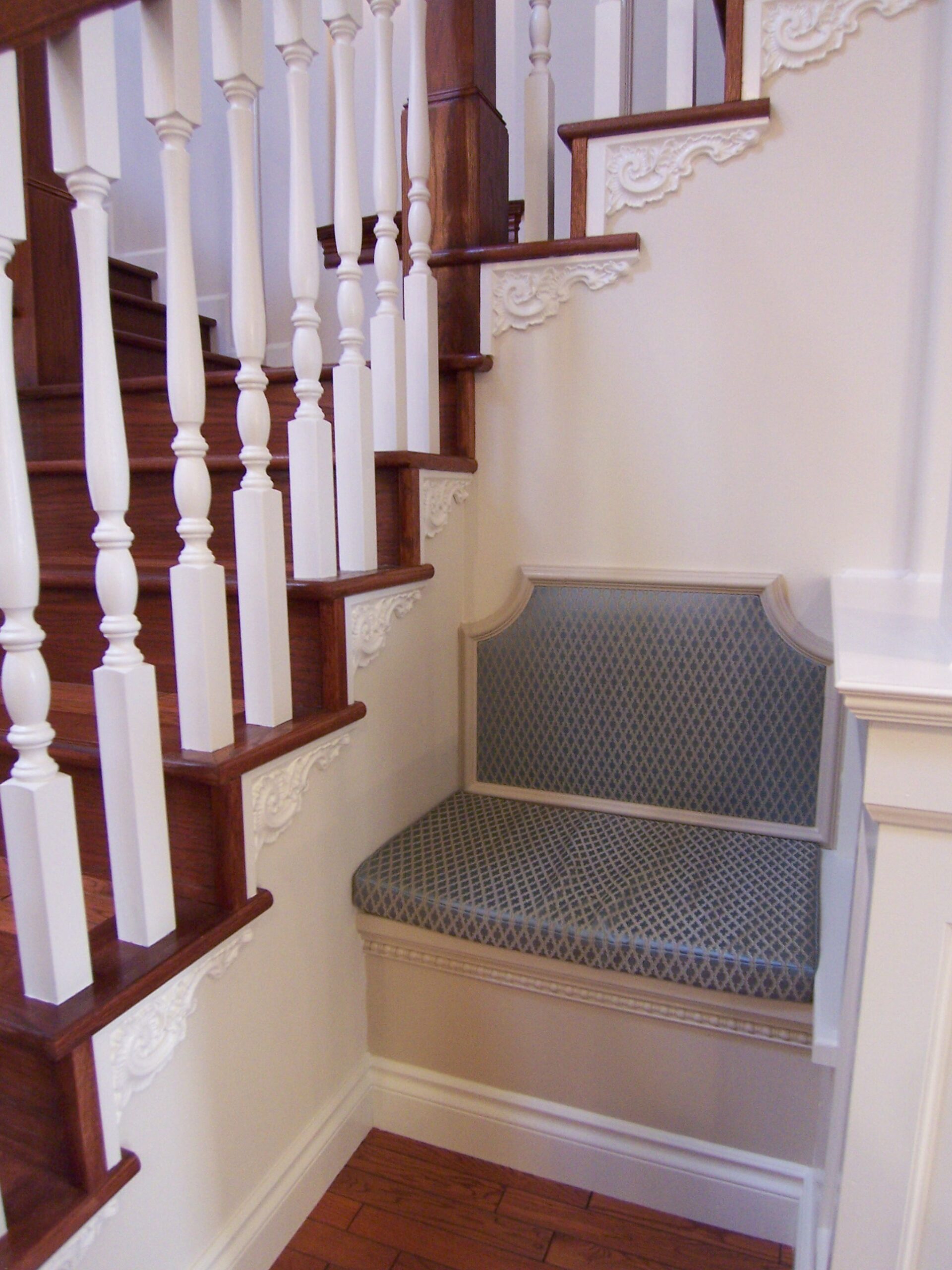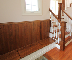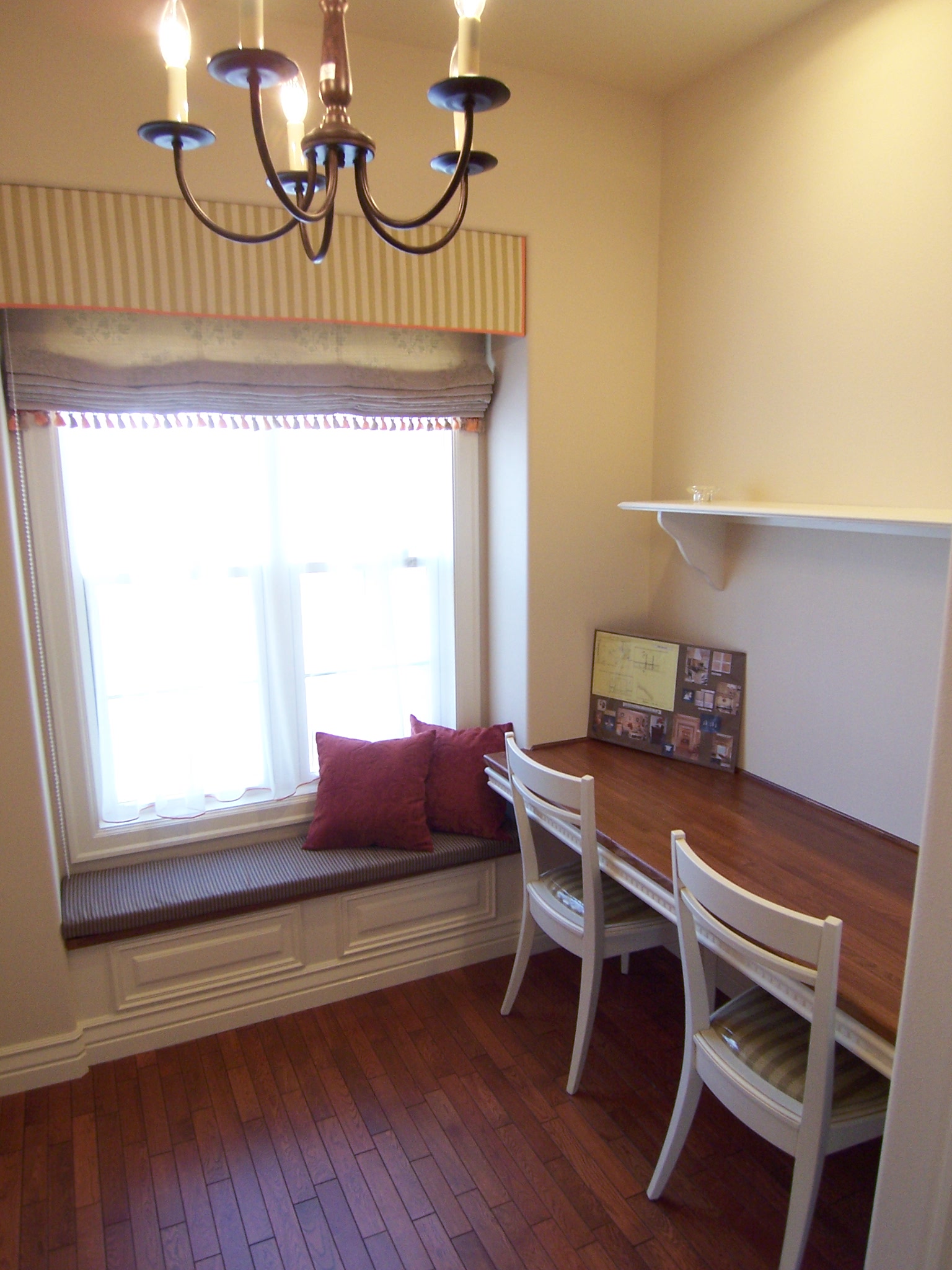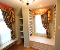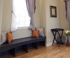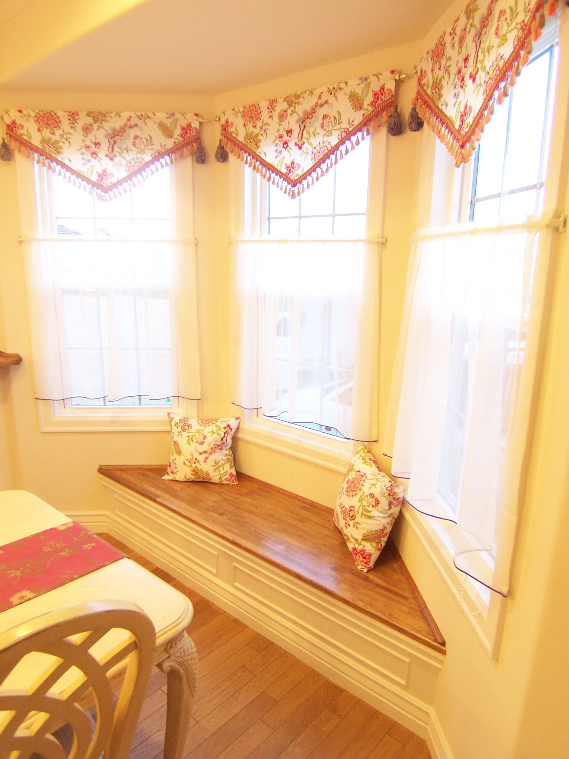 ベンチはよく出窓部分につくりますが、出窓がなくてもお部屋に変化を持たせたい場合などに採用します。側面の外側を二重貼りにして立体感を出したり、おしゃれな飾りをつけたり、帯を打ってエレガントな雰囲気を出したり、デザインもいろいろと手を加えることができるので、自分の好みに応じたベンチが楽しめます。