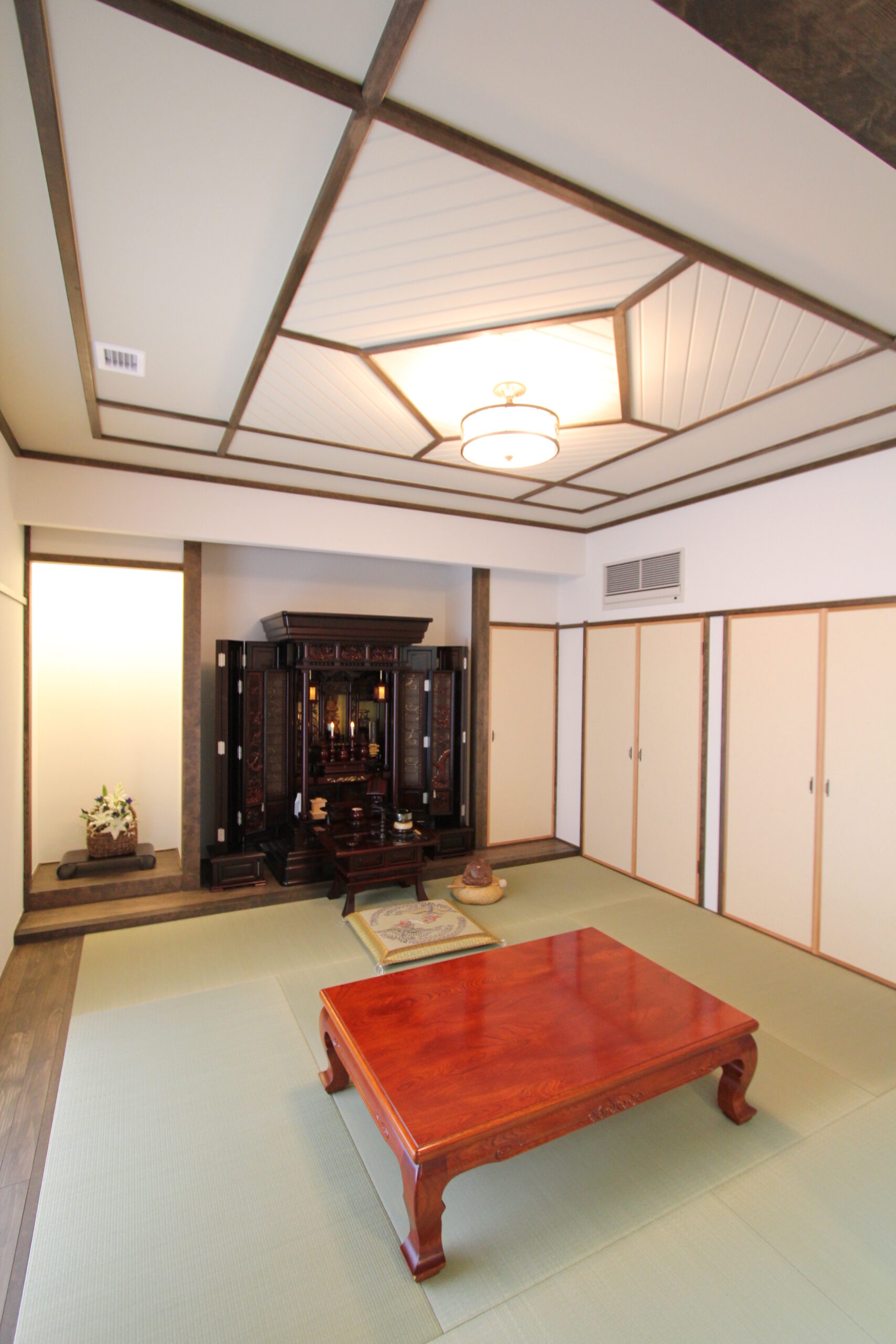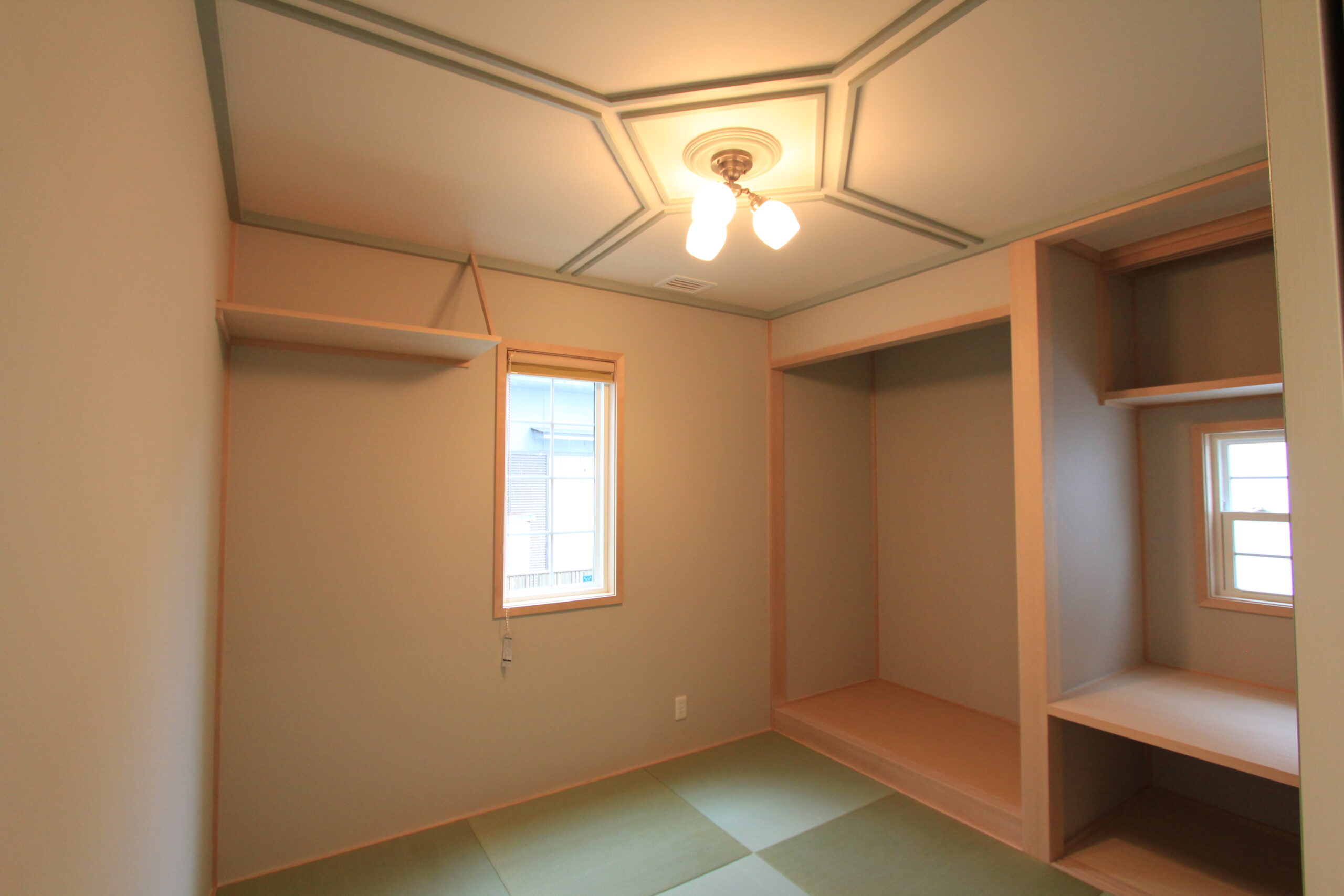 和室だけを見ると和風住宅と思えるレベルの仕上げも可能です。敷居、鴨居、欄間、長押、床の間、回り縁、天井板、障子、襖を取り入れた本格的な一室ができ上がります。