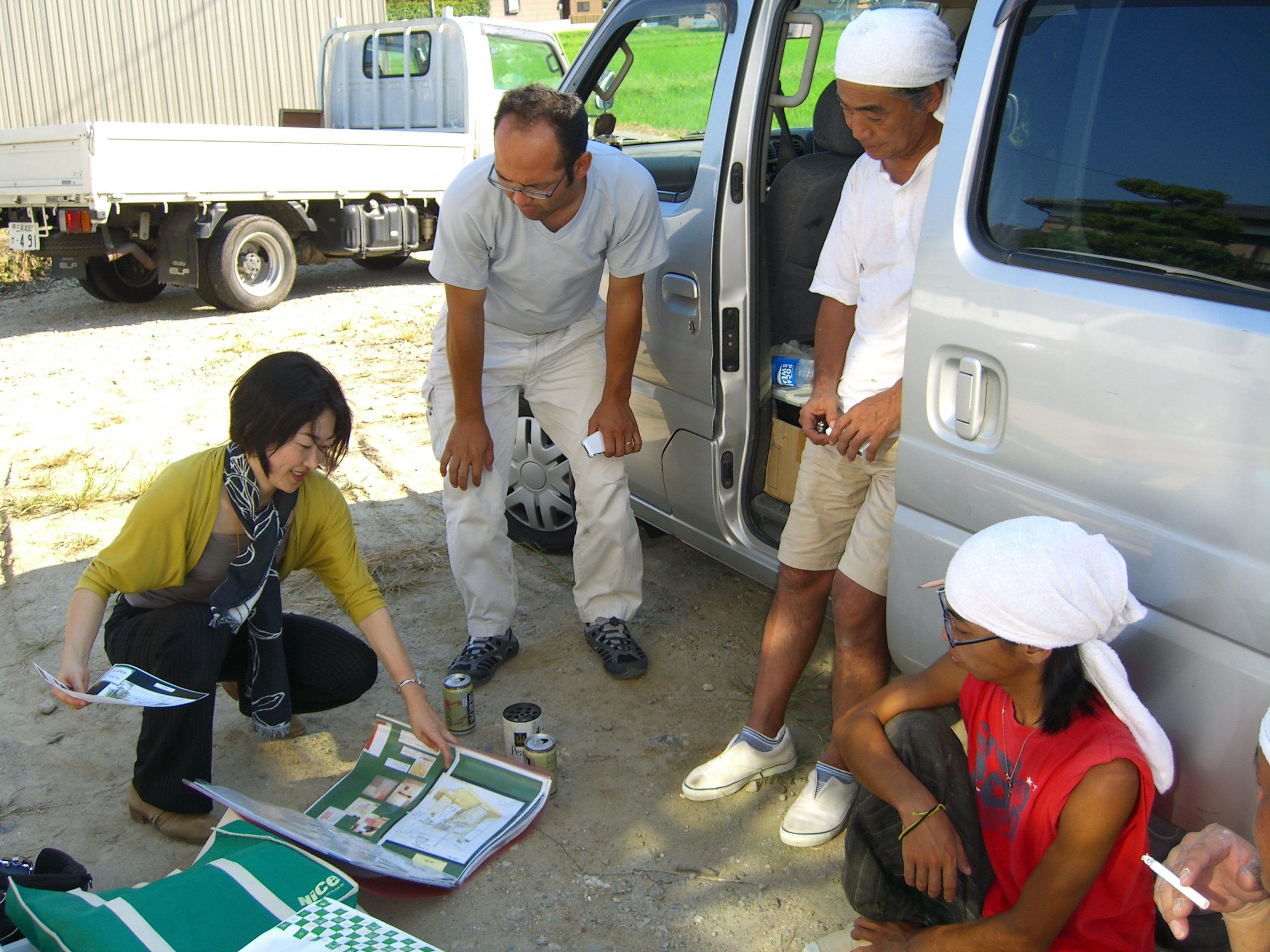 休憩時間中に外観デザインの細かな部分の収まりを話し合う職人たち