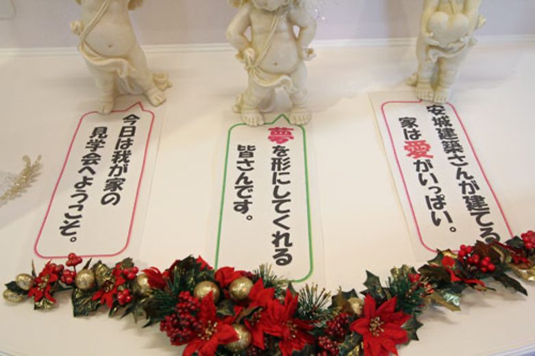 見学会の際、玄関ホールのニッチに飾ってくれたメッセージはお客様ご夫妻によるものです。(上記の物質的満足を超越した満足度がこのメッセージから感じて頂けるかと思います。中々この領域に達することは実に難しいことですが、この領域に達した時、家に魂が宿ったと感じます)