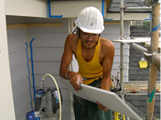 一見怖そうな職人だが、この職人はいつも本当にいい仕事をしてくれる。写真は8角形の窓の周りに取り付ける外壁材の装飾を加工している処。通常、この様に一枚でくり抜かず、一辺ずつに切断し、8枚を組み合わせて仕上げる。何故なら、手間が掛かるからである。