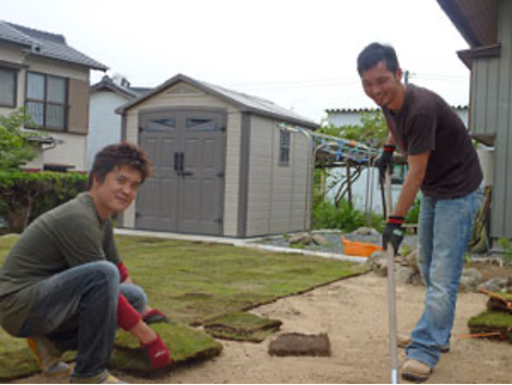 それは、同じく安建OBのお客様のU様宅にて一緒に芝はりをしているスナップ写真でした。T様邸は瀬戸品野、U様邸は額田。早朝7時から芝を張り始めたというから驚きです。
