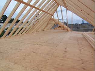 写真は、家が完成してしまうと通常あまり見ない小屋裏部分である。通常写真の様な床の構造用合板は2階の床は張られるが、2階の小屋裏部分までは張られない。理由は、あくまでも小屋裏であり、通常人が乗る部分ではないということと、合板の資材費と大工の手間を削減できる為である。