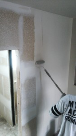 下記写真は、新築現場のドライウォール工法のパテ処理及び表面の凹凸の吹き付けが完了し、最終工程の塗装仕上げのワンシーンです。一般的なクロス貼りのパテ処理は2日程で終了する工程をこのドライウォール工法では10日程手間隙掛けてパテ処理をおこない、その後に塗装工程に入ります。