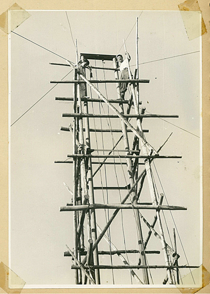 ■高所に生コンクリートを流し込むポンプ車が無かった時代はこの様にやぐらを組み、滑車で生コンを高所に揚げ、そこから先は一輪車で運搬して型枠に流し込むという気の遠くなる作業をしていました。生コンは重く、不安定で細い足場の上を運搬することはもはや命懸けの作業です。塔屋に立つ写真左側は現安城建築会長の若い頃です。