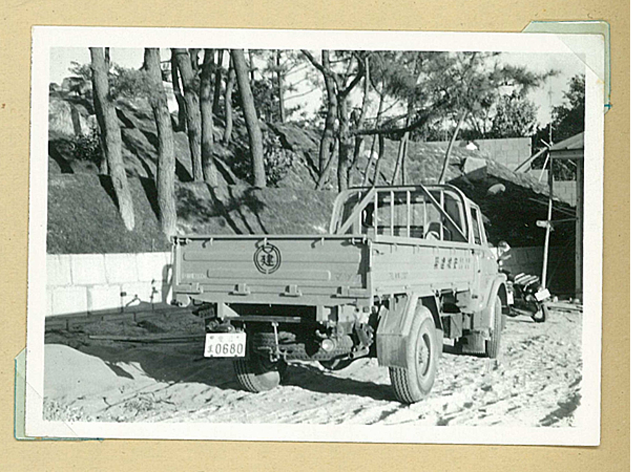■先代曰く三輪トラックは、時々カーブでバランスを崩しひっくり返ったそうです。トラックの後部に昔の安建のマークが描かれているのが分かりますか。