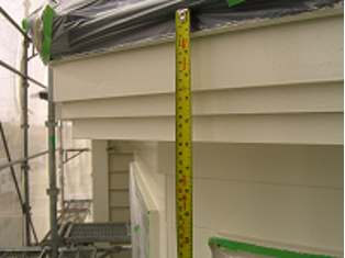 (補足解説⇒軒裏のサイディングも14㍉厚のサイディングを使用。一般的には6㍉~8㍉程度。ケイカル板はサイディングに比べ、耐水性が劣る為、古い家屋等では、ケイカル板が垂れ下がっている家を時々見掛ける)