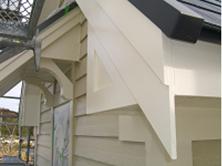写真は彼の仕事の一例。如何に手間が掛かっているかが解る。通常、外装材は1枚張り。窓廻りに枠をまわしても2重張りどまり。