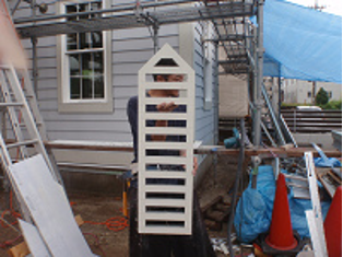 写真は、現在大府市で施工中のイタリアンテスタイルの現場での作業風景。外部の装飾に使用するパーツを一枚の外装材から切り絵の様に細工を施している。もはや建築の領域を越し、アートの領域に達していると感じました。