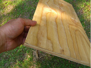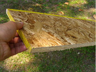 2枚の写真はツーバイフォー工法で使用される構造用合板。片方は針葉樹合板。片方はOBS合板。コストを比較すると木のチップを固めたOBS合板の方が安価であり、建築ではコストを抑えたアパートやローコスト住宅に使用されています。梱包用の養生合板に使用されているものも見かけます。