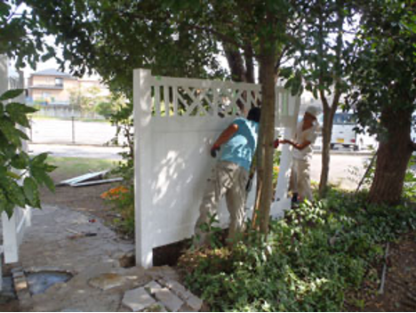 築15年を迎えたモデルハウスの、木製フェンスをバイナルフェンスに取替えています。樹脂製なので、メンテナンスフリーです。