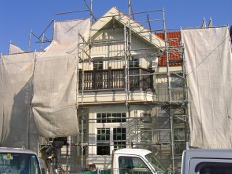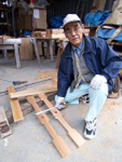 ⇒デッキの手摺も全て職人の手造り。数十枚に至るパーツは、青山大工さんが一枚ずつ杉板から切り出し、丁重に加工してくれた。この後、耐急性を増す為に高性能な塗膜防水を施工し、その後、更に塗装職人により、シリコン塗装を数回重ね塗りを繰り返した後、ようやく完成する。