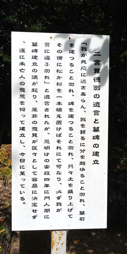 尊徳先生は自身が亡くなる前に弟子達に分相応の墓にすることを伝えました。(充分過ぎるほどの功績を残されたにも関わらず最期まで自身の生き方を貫き通すのは本当に凄い方です)手前の墓石は後に尊徳先生を慕う人々により立てられたそうです。