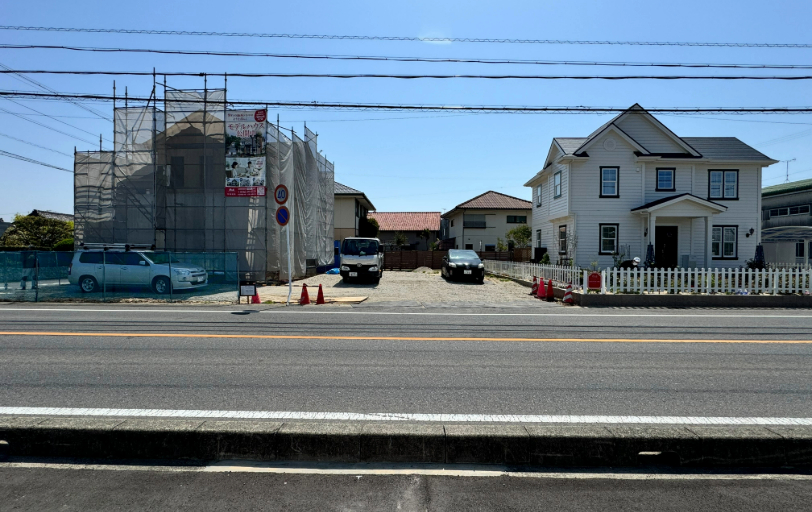弊社OBのお客様の土地を販売致します。売主であるお客様の家と現在新築中のお客様、そして今回ご案内するのが中央の土地です。売主であるOBのお客様より、安城建築の家を三棟並びにしたいというご希望を持って頂いており、本当に感謝に尽きます。