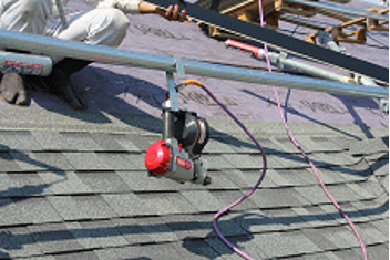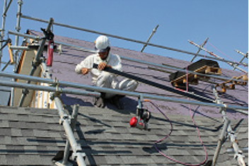 急勾配屋根は何もかもが滑り落ちる。急勾配屋根の上で効率よく仕事をする工夫はさすが職人。