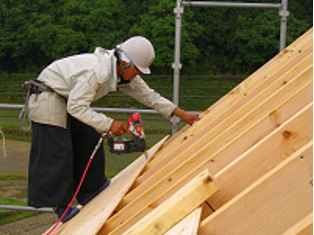 以前、大工と一緒に屋根合板を張ったことがあるが、これだけの屋根の勾配で1日作業をすると足首と足の裏に激痛を伴い、まともに歩くことすら出来なくなる。屋根の上を機敏に動き回り、足が痛いだのなんのと愚痴も言わず・・・大工は凄いと思う。