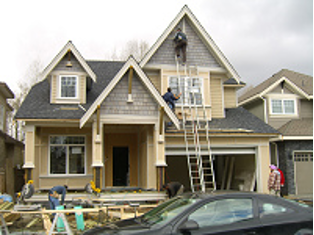 写真は、建て方中の現場であり、現場フレーミングで施工される純粋な北米式ツーバイフォー工法で建てられている。
