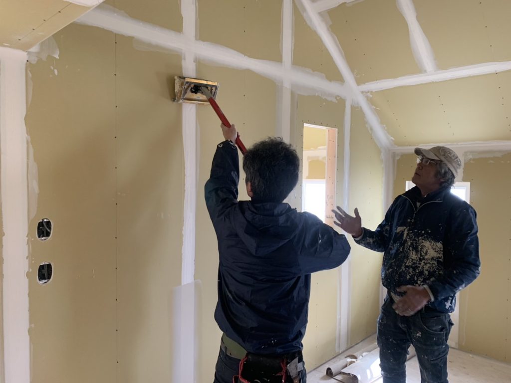 先日長野県の律儀な塗装屋さんより「ドライウォールを学ばせて頂けないでしょうか」と熱心なオファーがあり、弊社のドライウォール職人の親方にその旨を伝え指導してもらいました。教えるというとなるとどうしても手が止まり仕事の妨げとなりますので、二時間程度かと思っていましたが、8時~15時まで現場だったと聞き、学ぼうとする熱意に応えてくれたのだと思いました。