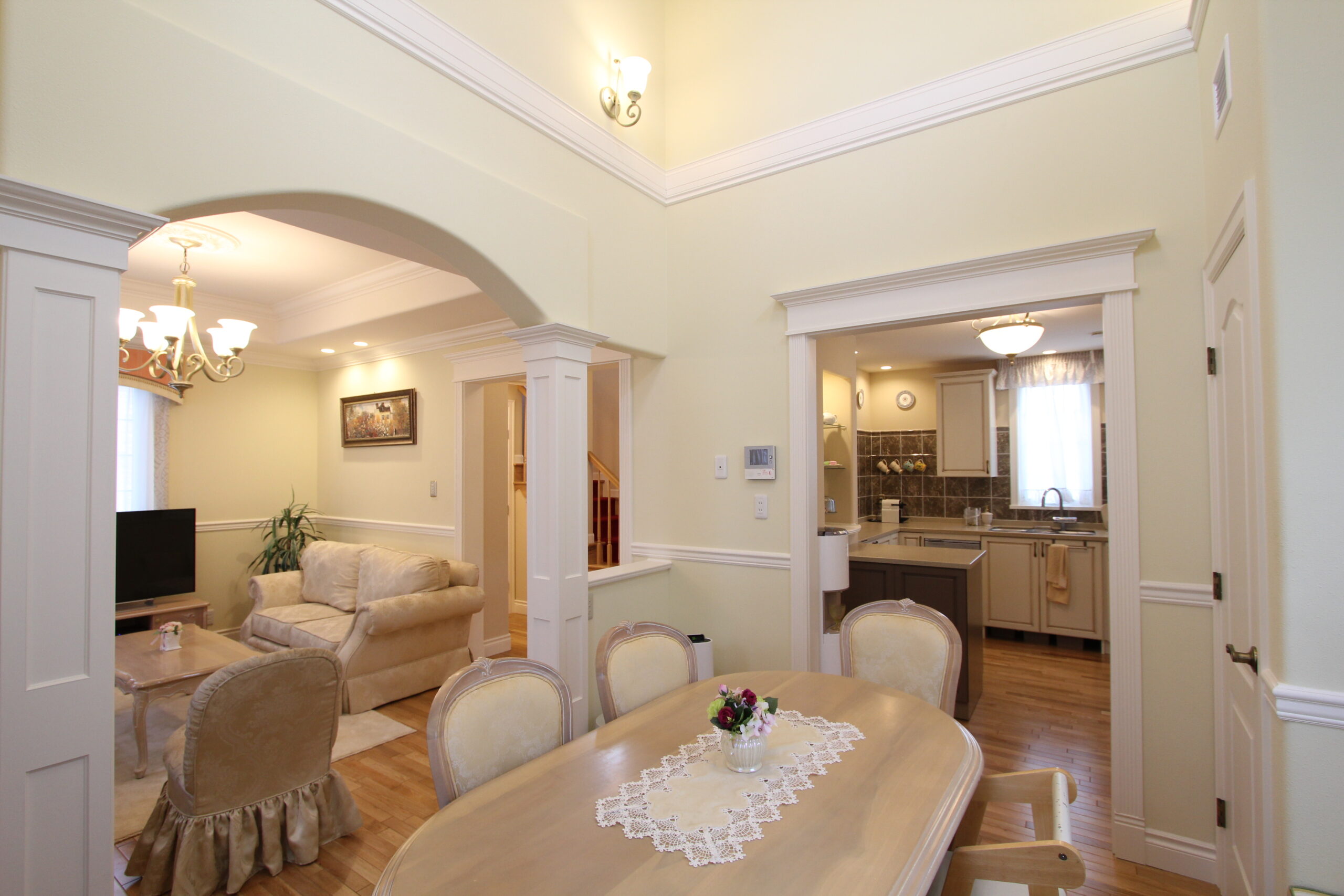 奥様憧れのロンドンのタウンハウスやパリのアパルトマンをイメージした素敵な外観。ベットルーム、浴室などのプライベート空間は1階と3階に。家族、お友だちなどが楽しく集まるパブリック空間となるリビング、ダイニング、キッチンは2階となっています。より良い室内空間の実現を考え、玄関は中2階となっています。各階は15坪以内となっていますが、2階から3階にかけての吹き抜けなど考え抜いた設計により、美しく、かつ機能的な魅力溢れる室内空間を実現しています。